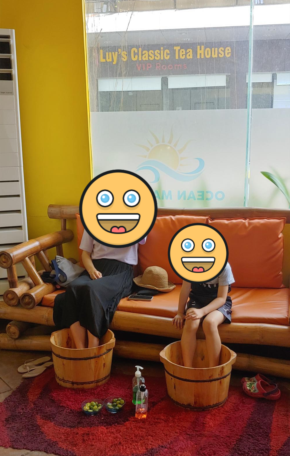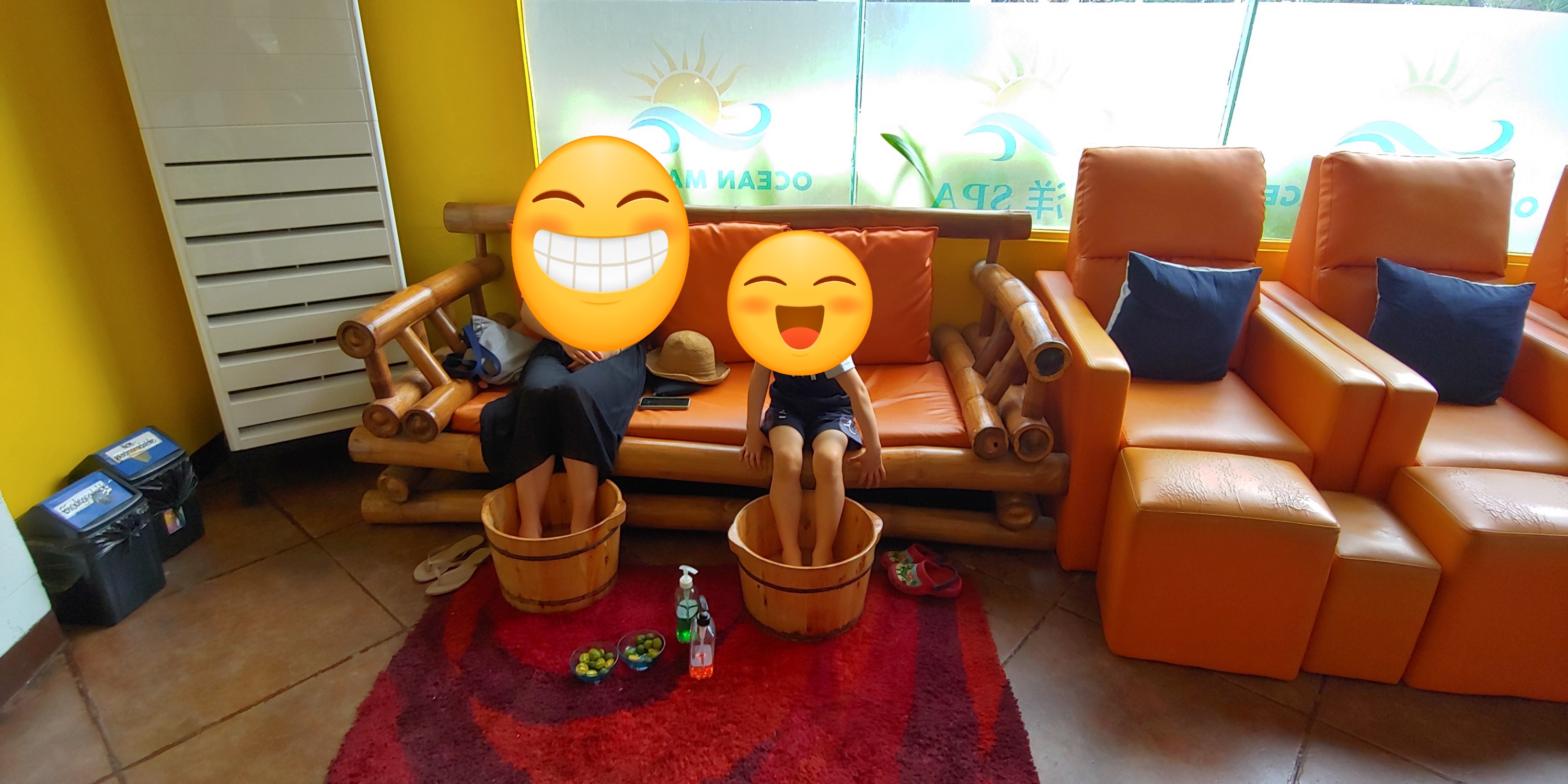 마사지 받기 전에 먼저 나무 통을 가져와서 깔라만시로 발을 씻겨 줬습니다