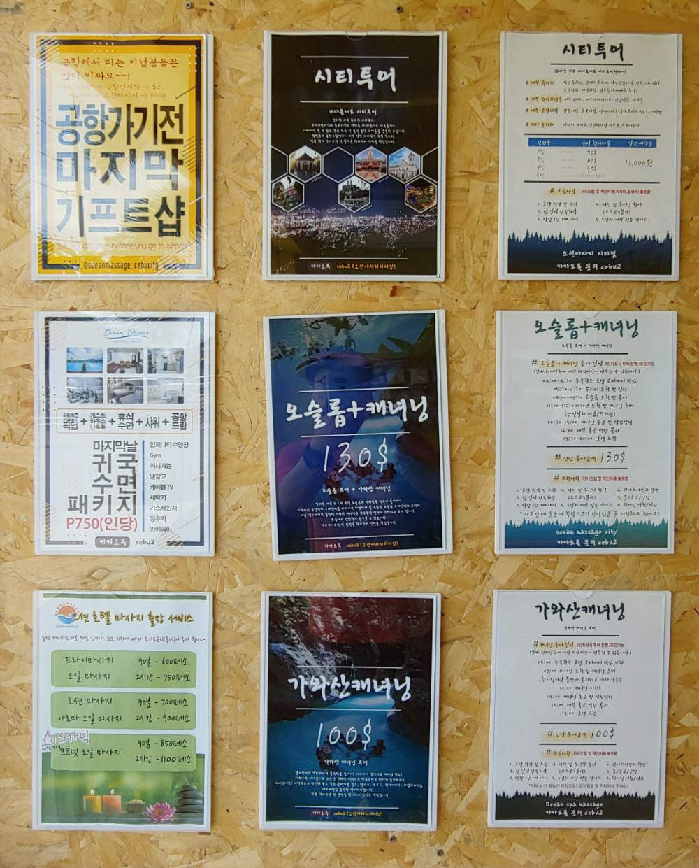 마사지 가격은 발마사지 30분 200페소 60분 350페소, 성장 마사지 60분 300페소 90분 450페소, 오일 마사지 60분 350페소 90분 520페소 120분 700페소, 아로마오일 마사지 60분 450페소 90분 620페소 120분 800페소, 핫스톤 마사지 60분 600페소 90분 900페소 120분 1,200페소 였습니다