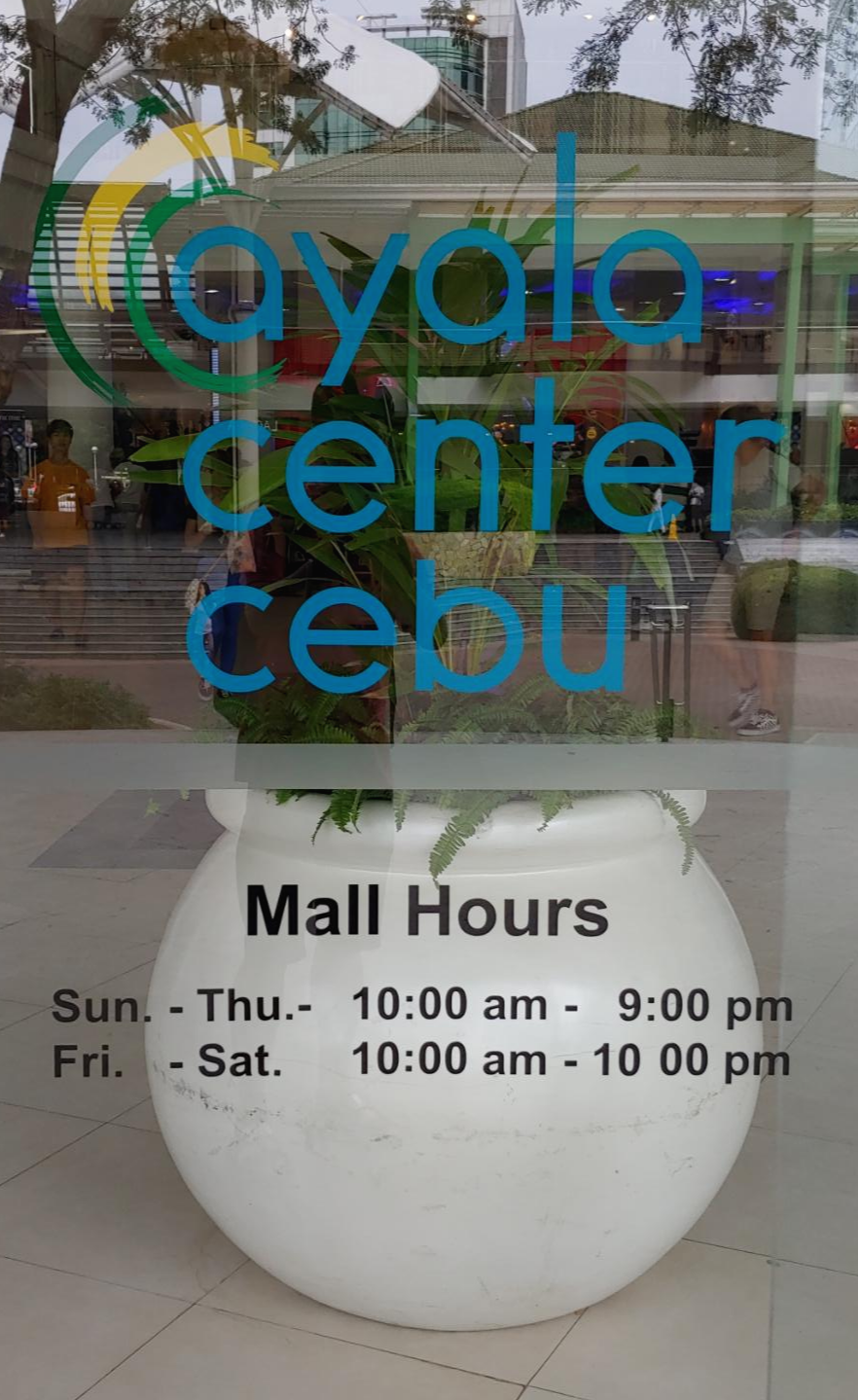 아얄라 몰(AYALA CENTER CEBU)에 도착하니 유리에 영업시간이 적혀 있었습니다