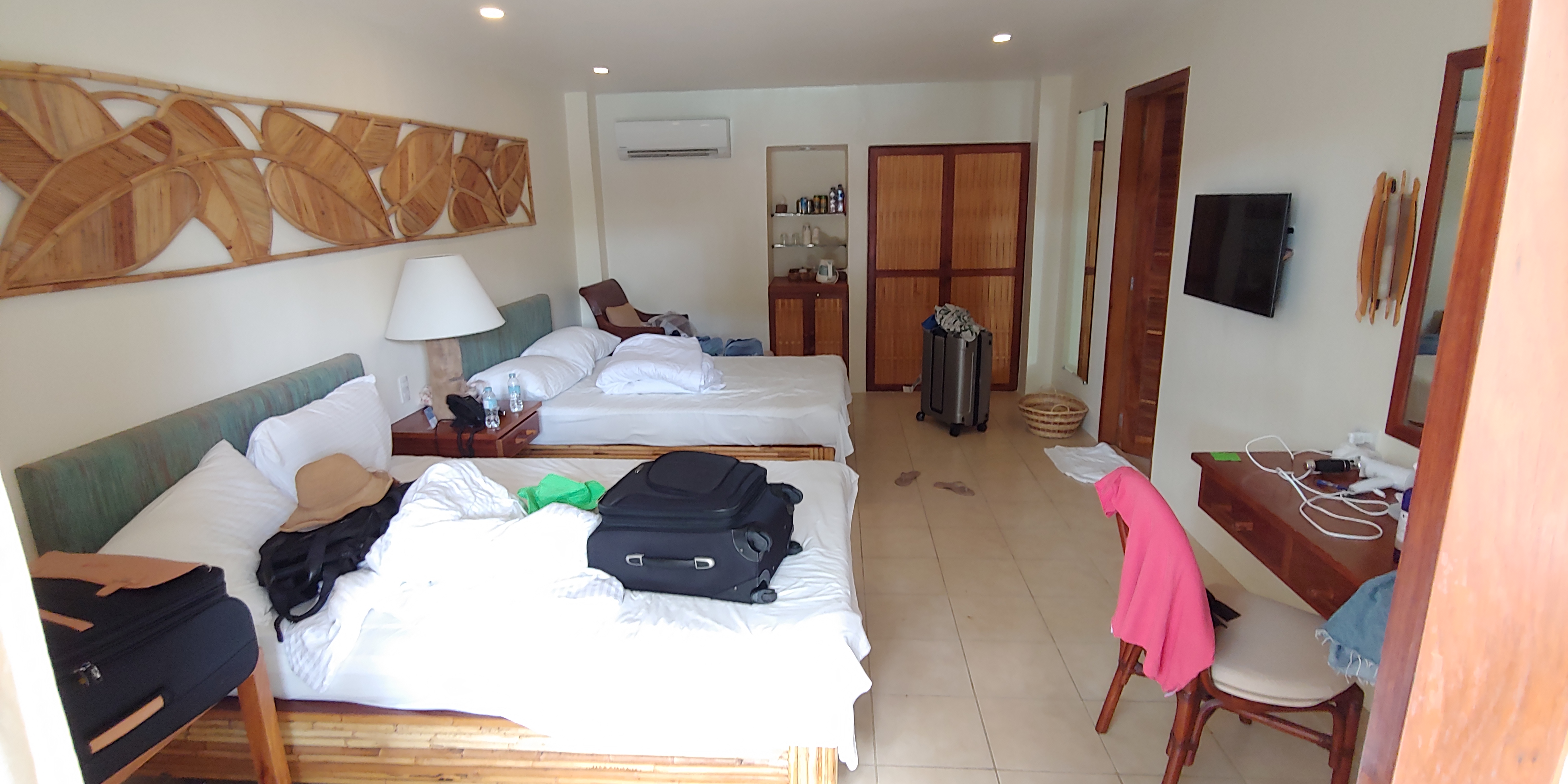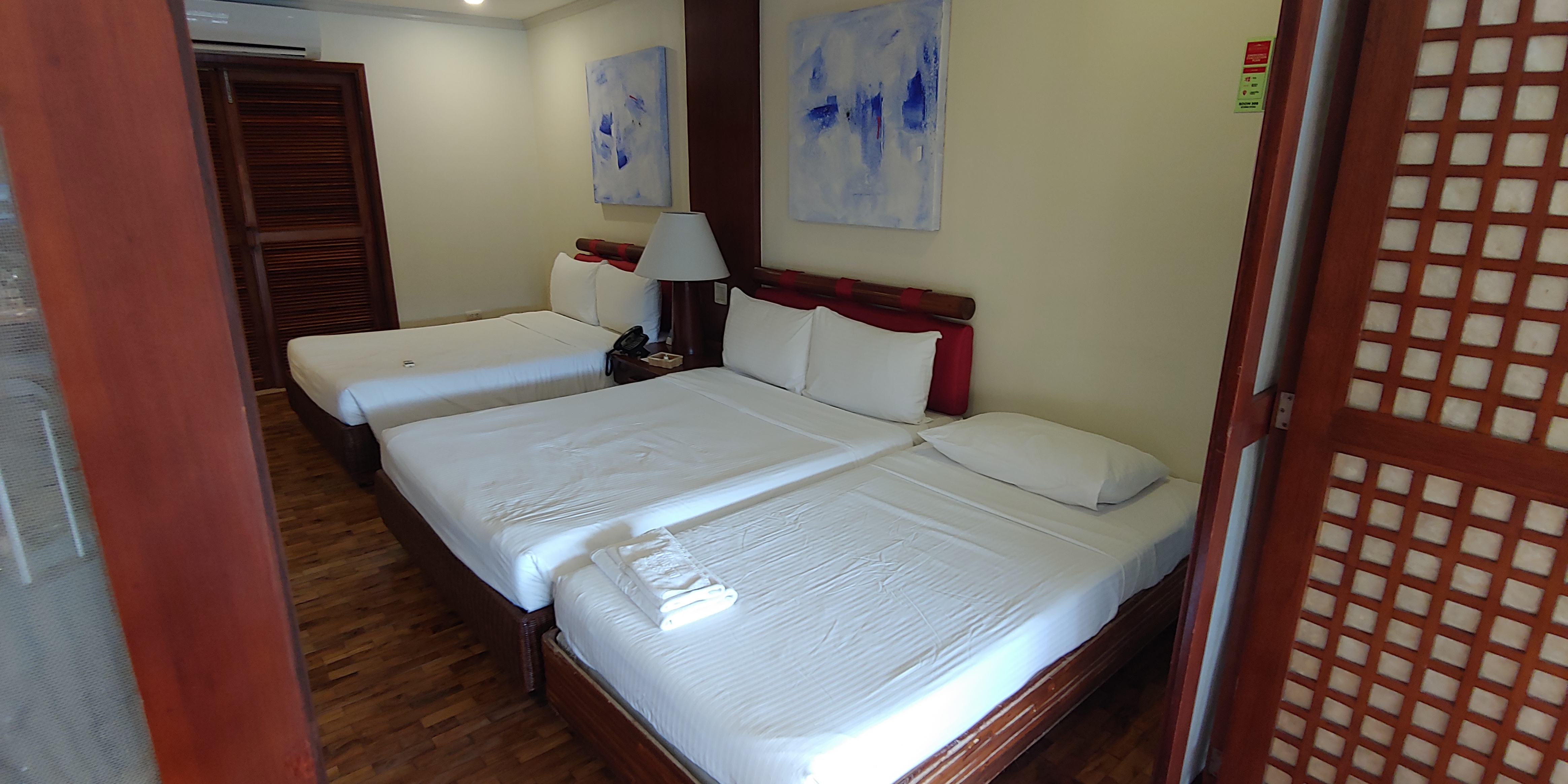 아래 사진에는 더블 침대 3개 인것 같아 보이는데 객실 문쪽에 붙어 있는 침대 1개는 싱글이고 나머지 2개는 더블 사이즈 침대였습니다