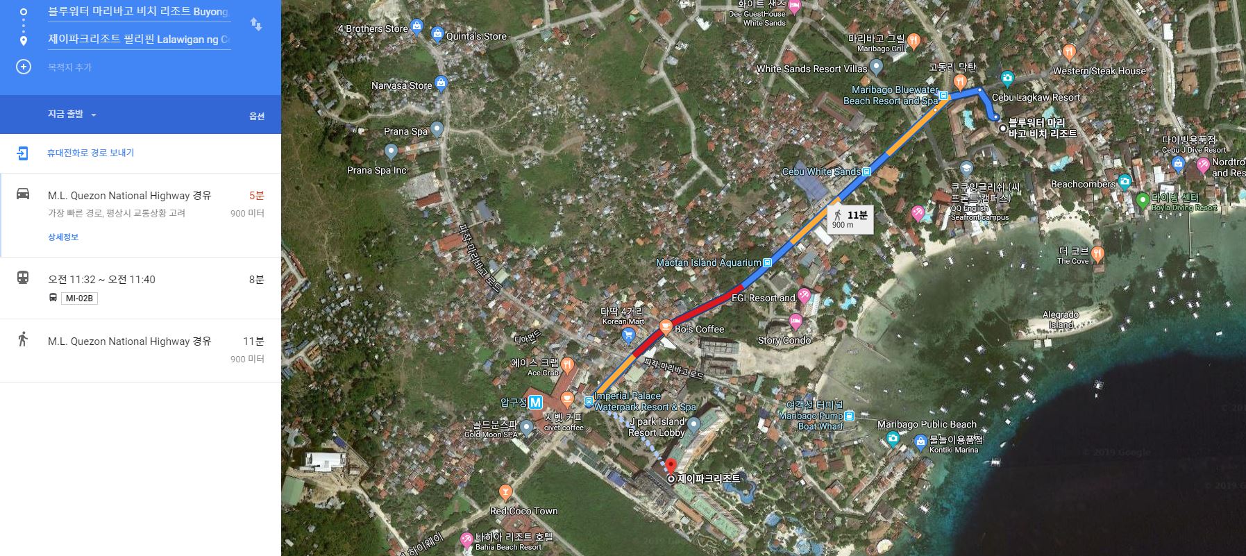 구글 지도로 검색해봐도 블루워터 마리바고 비치 리조트(BLUEWATER MARIBAGO BEACH RESORT)와 제이파크 리조트(JPARK RESORT)의 거리는 900m라고 나오는데 차량이 많이 없는 시간에 걸어가 보시는것도 괜찮았습니다