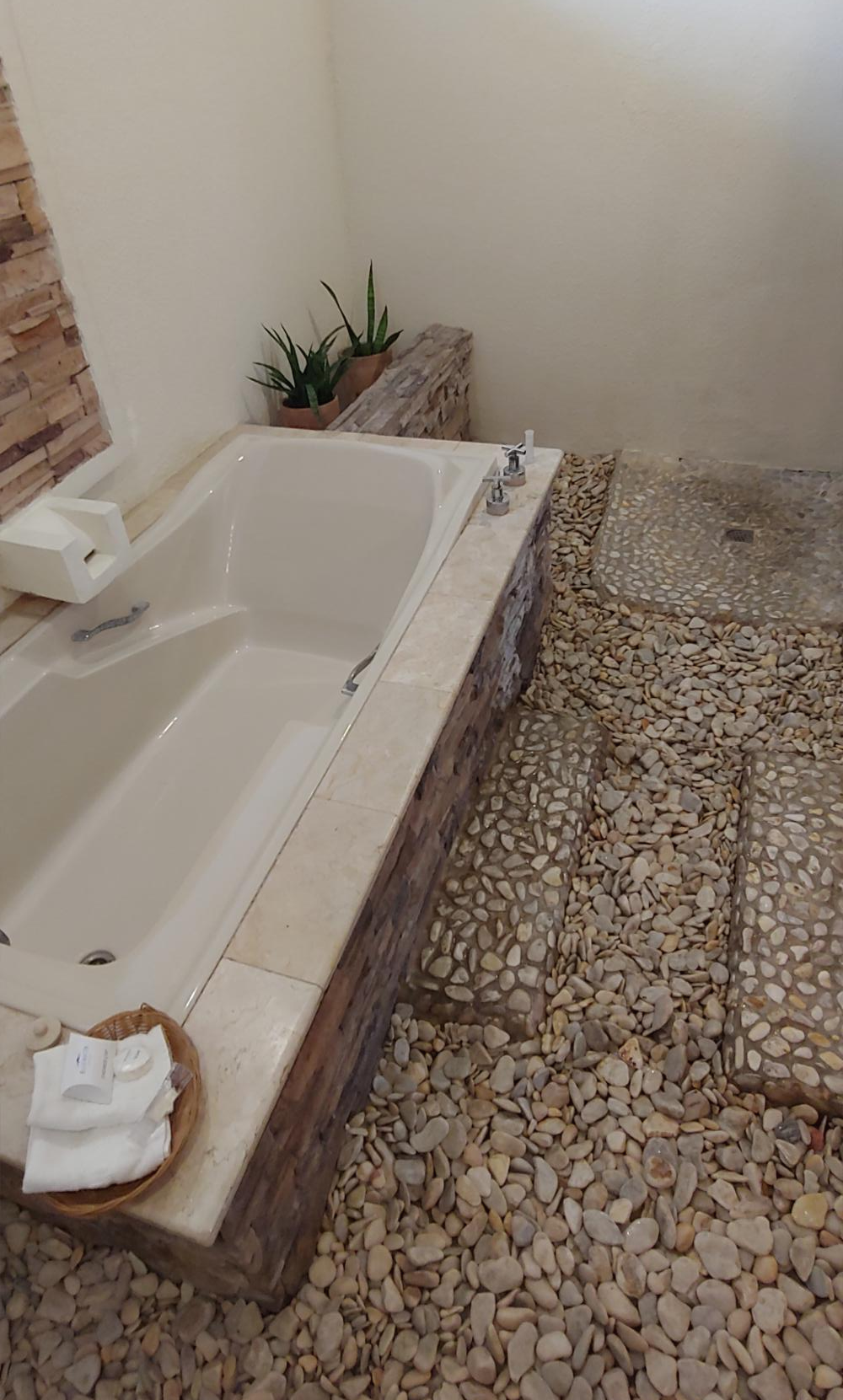 객실 문을 열었을때 정면에 보였던 문을 열면 생각보다 큰 공간이 나오고 바로 들어가서 왼쪽은 세면대 오른쪽은 화장실이 있었고 그리고 바닥에 돌을 깔아놓고 그 중간에 욕조가 있었습니다