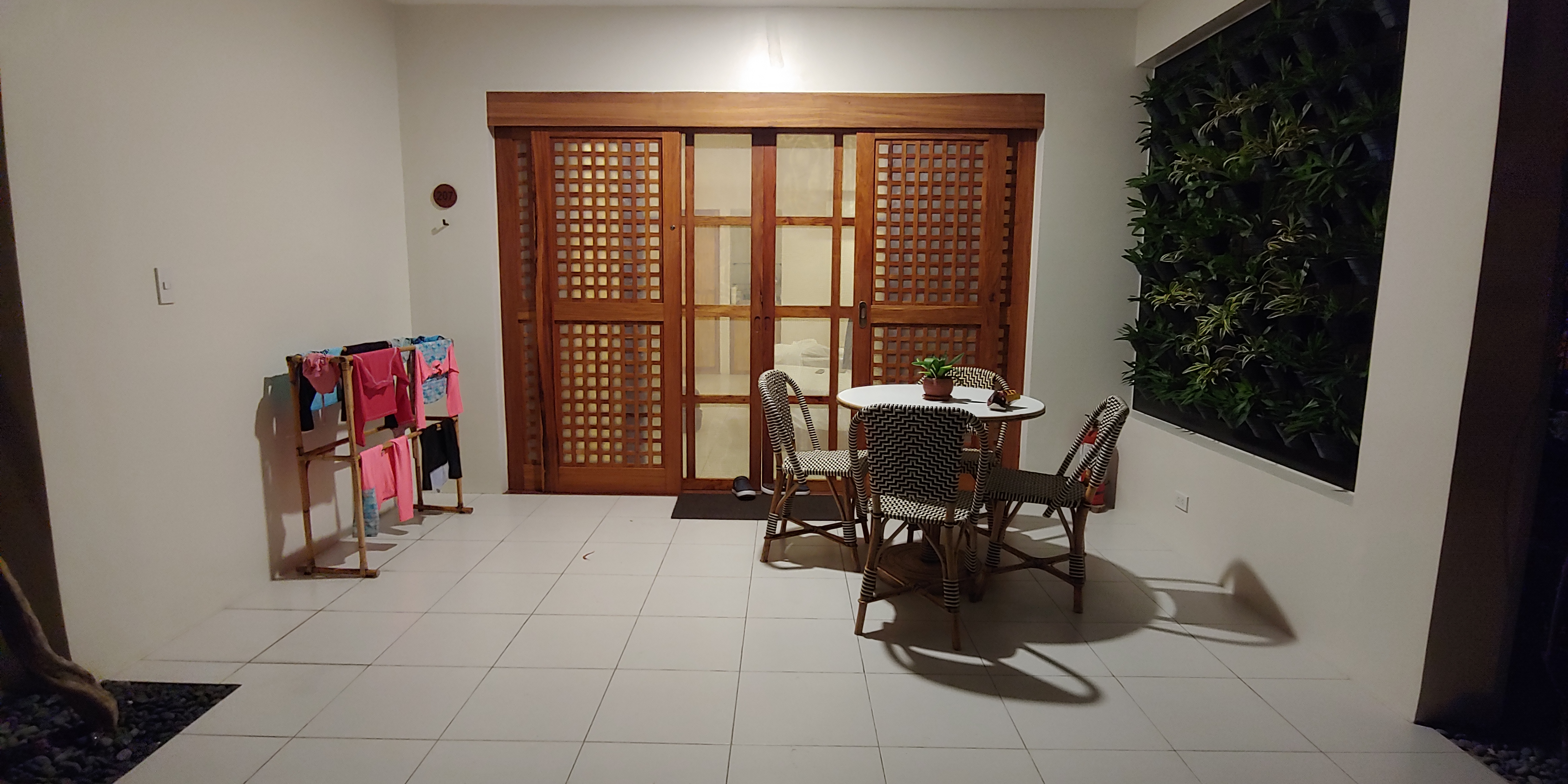 객실 앞에 식탁과 의자 그리고 빨래 건조대가 있었습니다