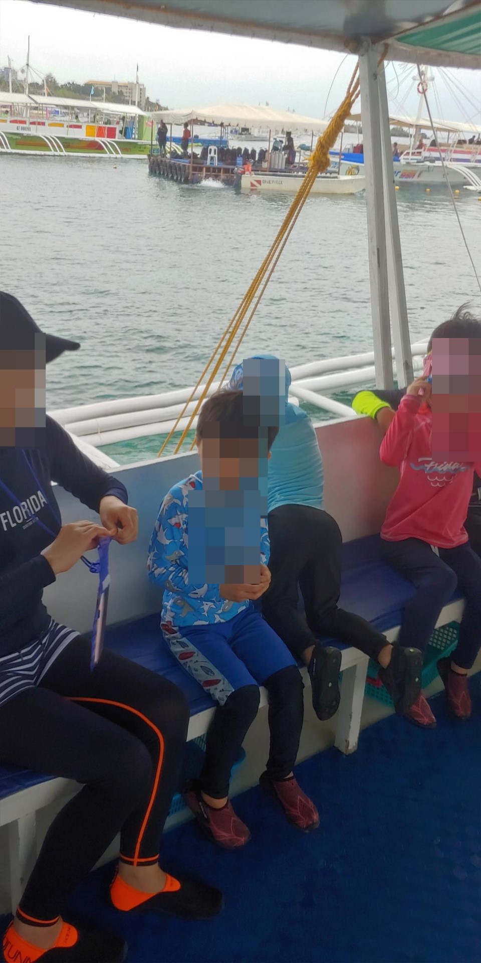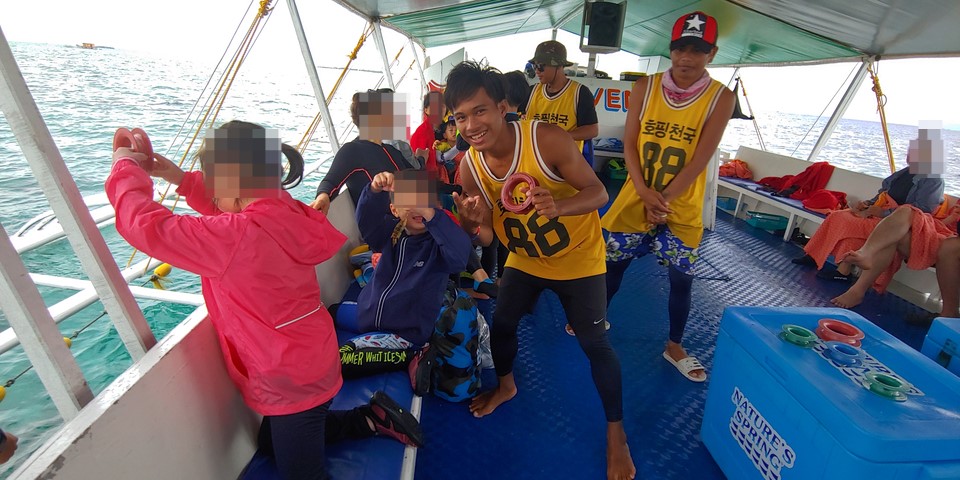 호핑 투어 배를 타고나면 가족별로 자리 이동 후 호핑투어 동안 도와줄 스탭들 소개를 해주었습니다