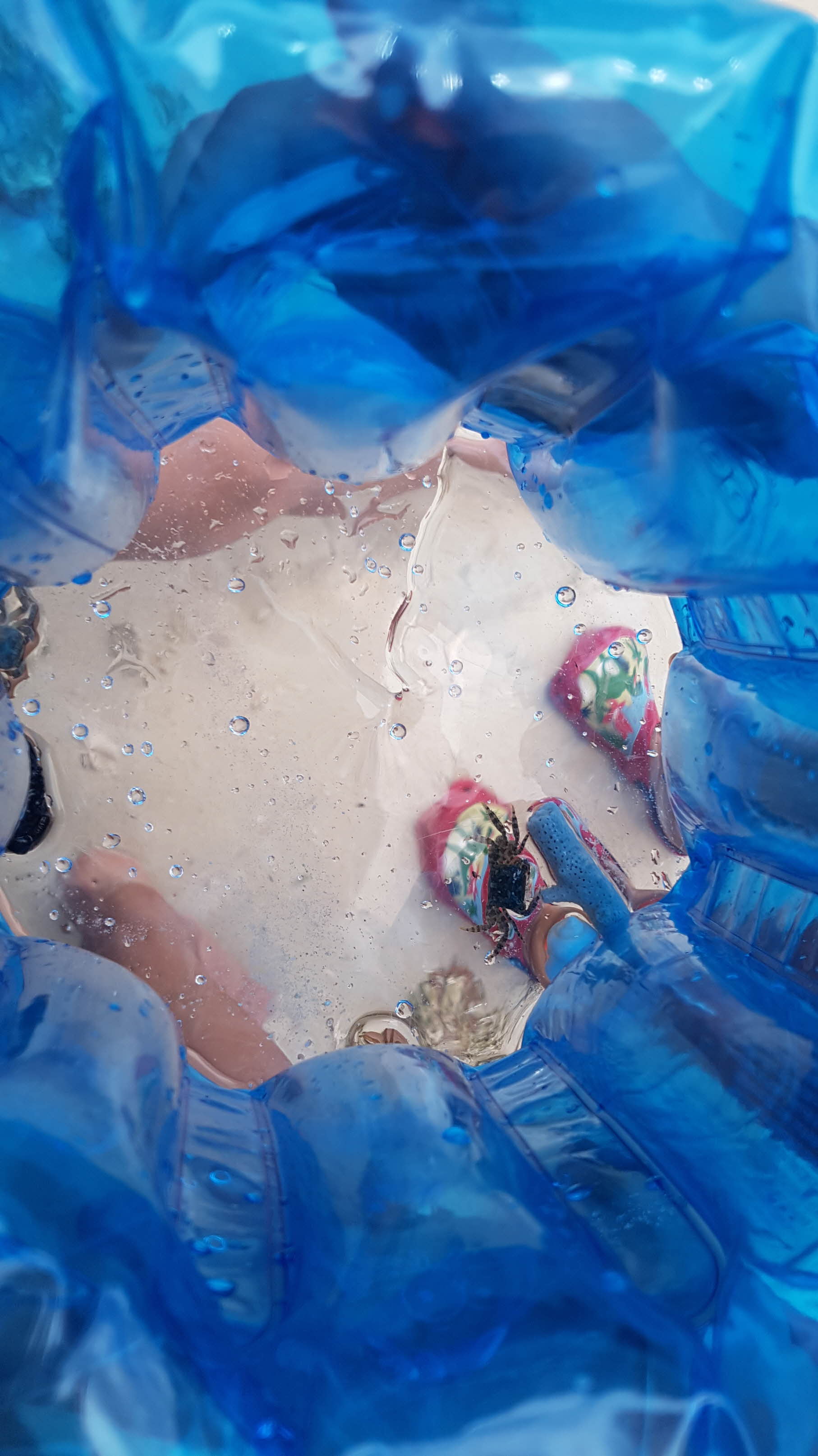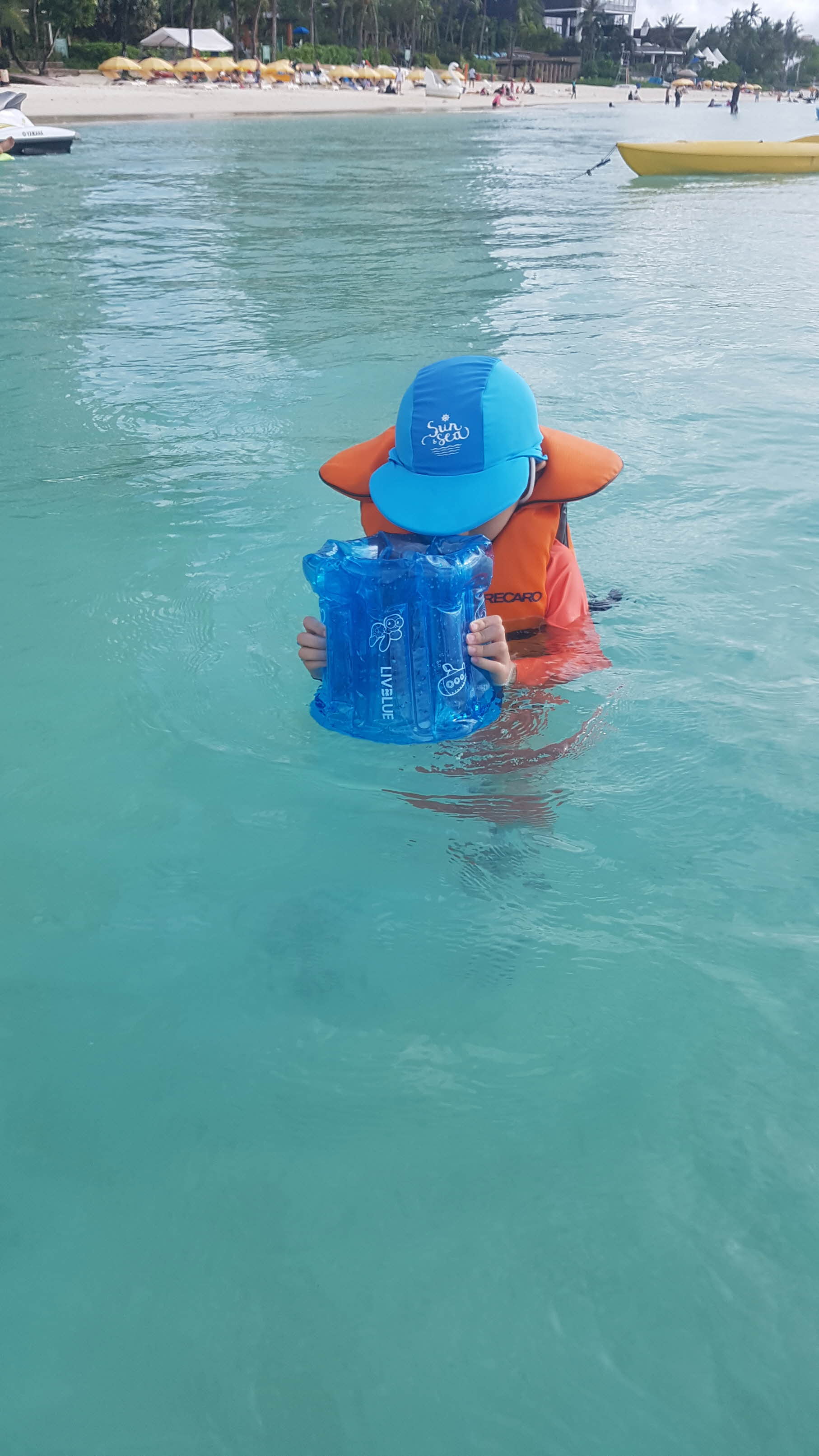 아이들은 스노클링 장비를 사용하기 어려우면 아래 사진과 같은 공기를 불어 넣어서 얼굴을 갖다대고 물 속을 볼수 있는 장비를 유용하게 사용했습니다