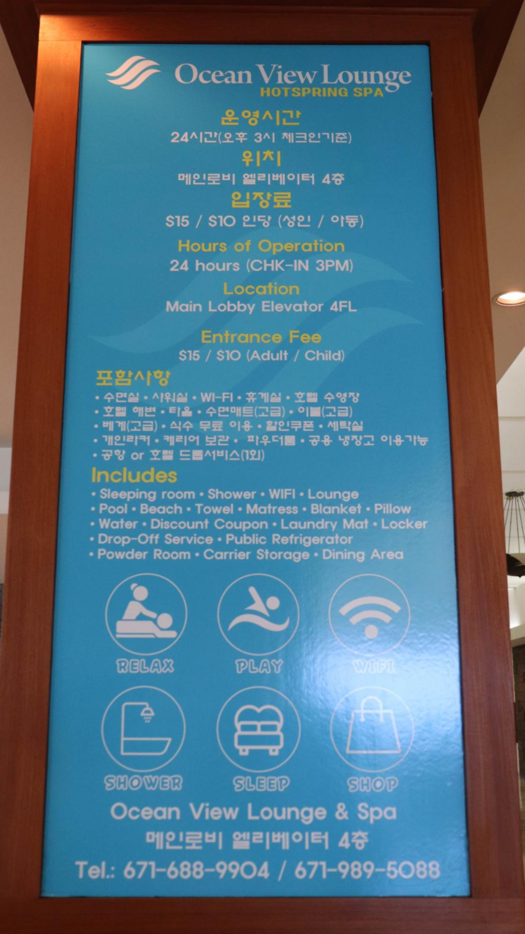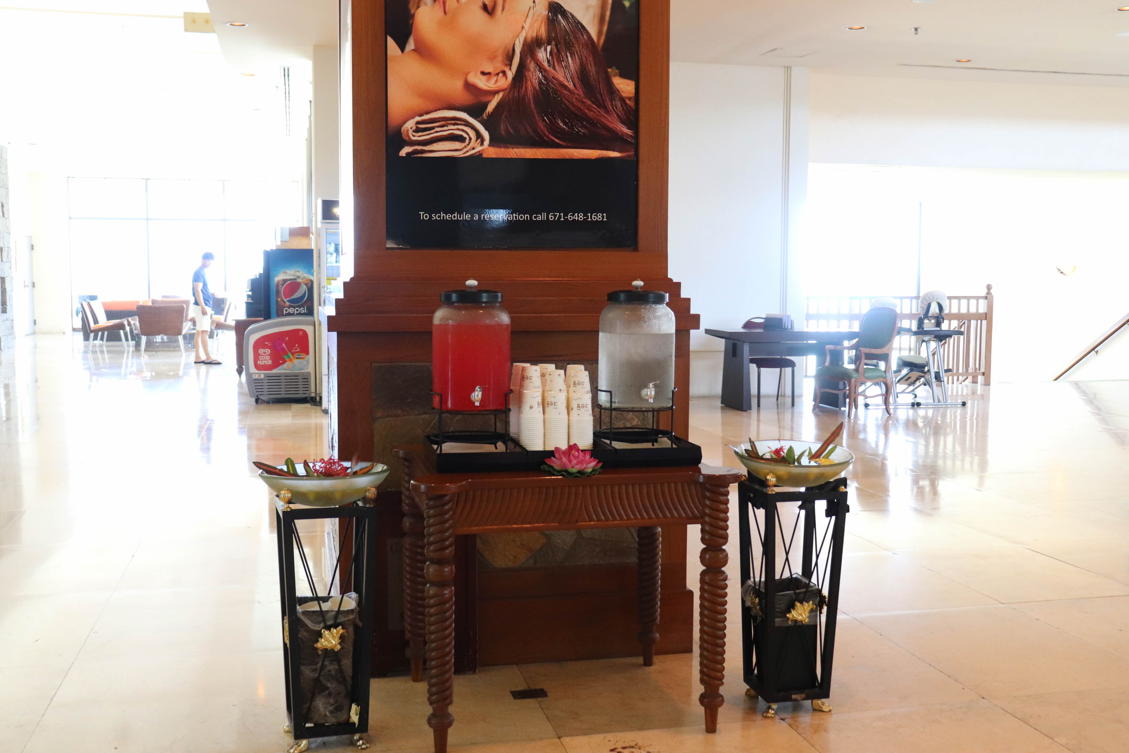 퍼시픽 스타 리조트 & 스파(Pacific Star Resort & Spa) 로비 출입문을 들어가면 음료와 물이 준비 되어 있습니다