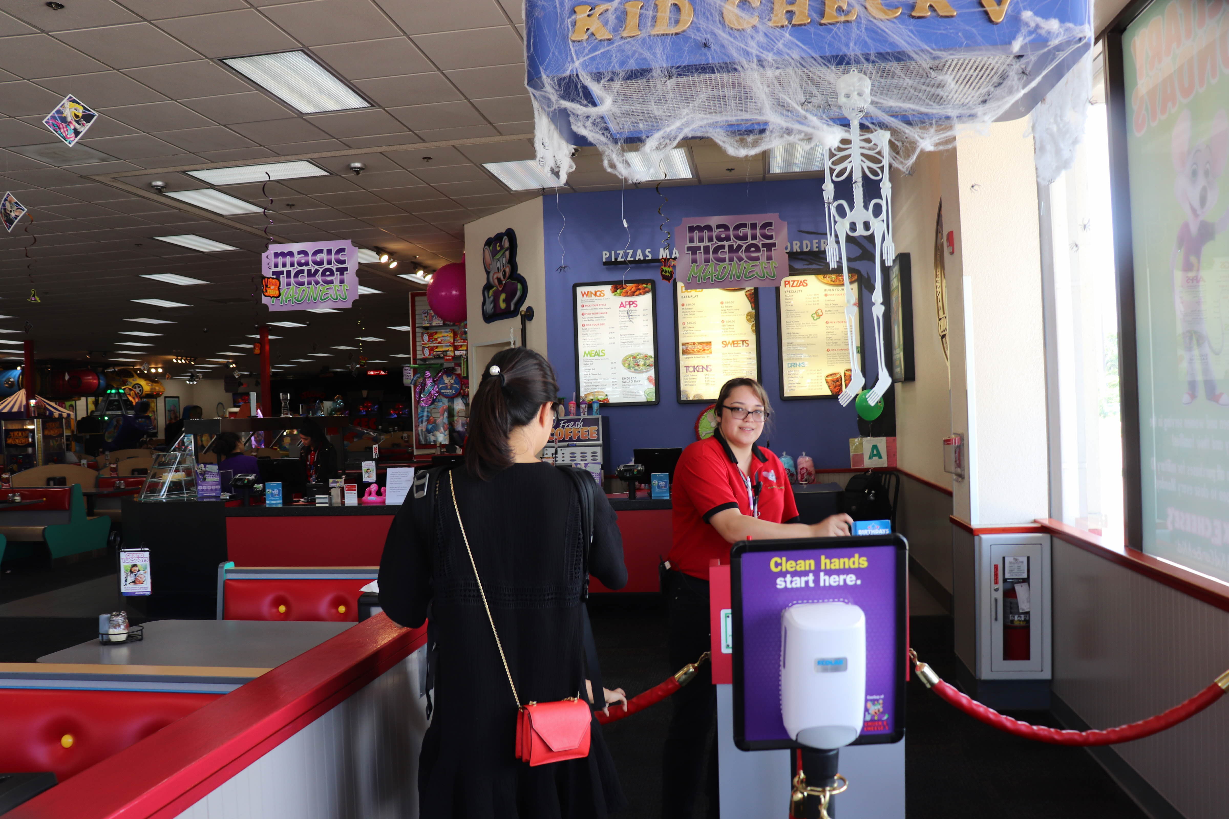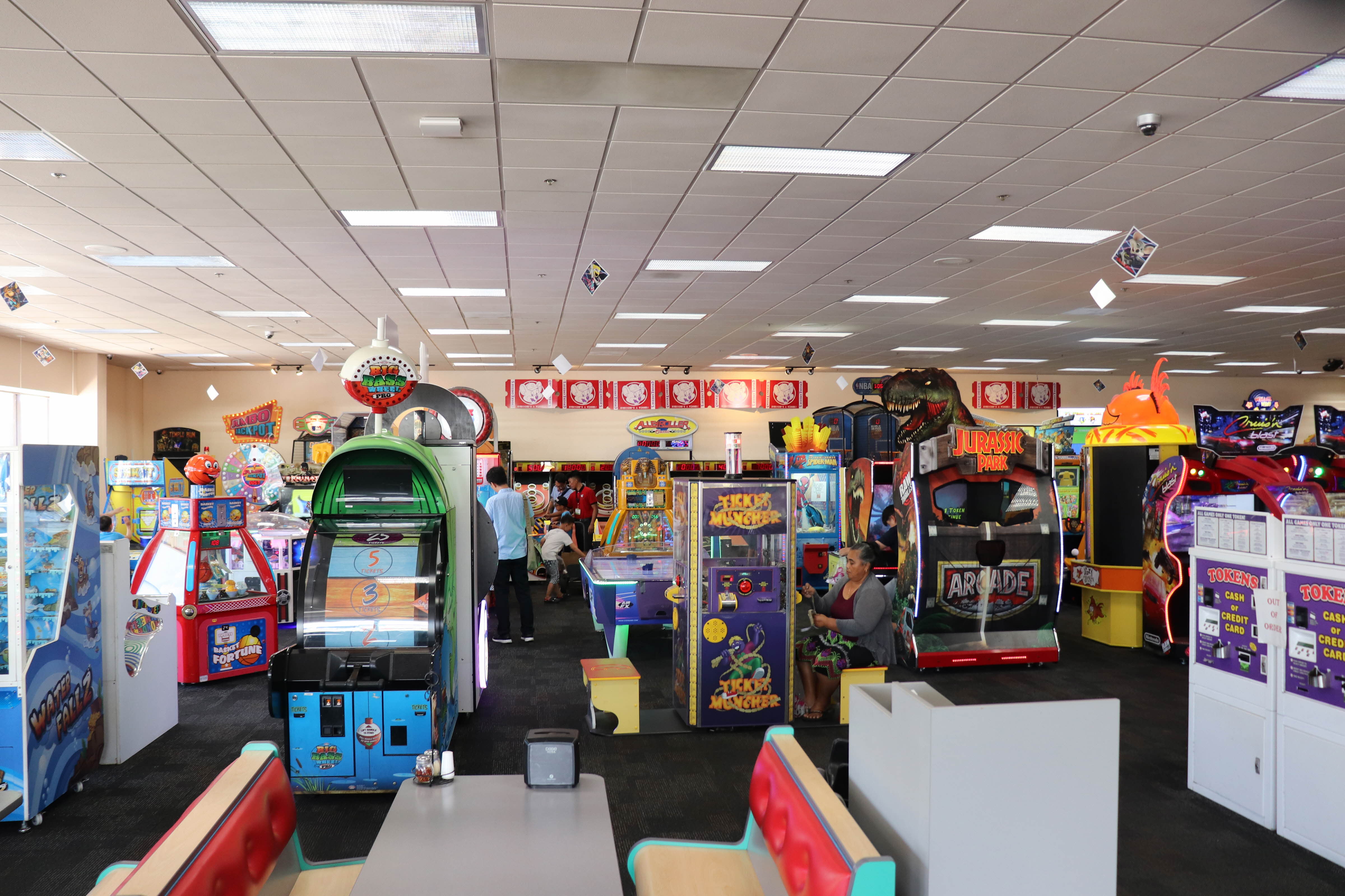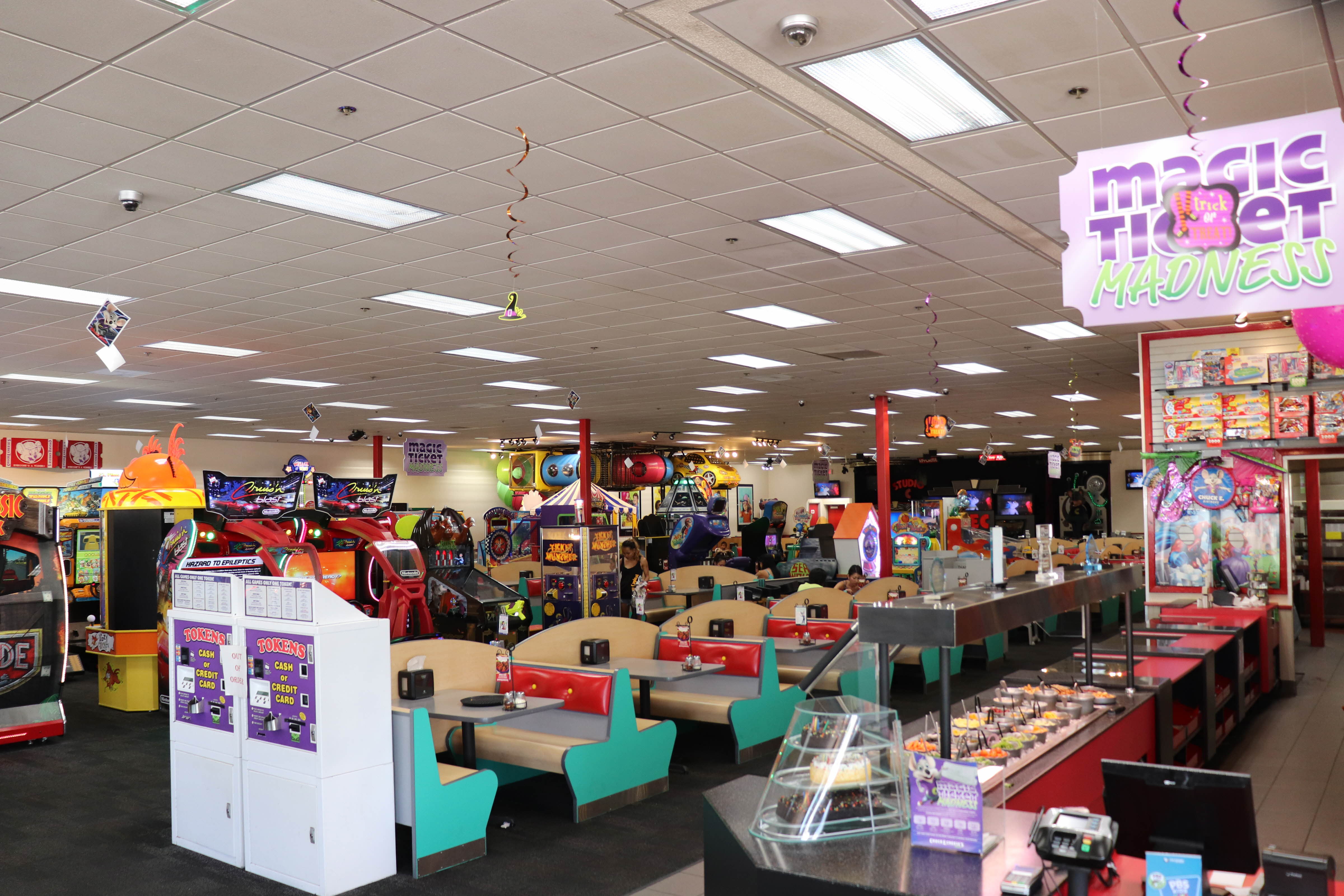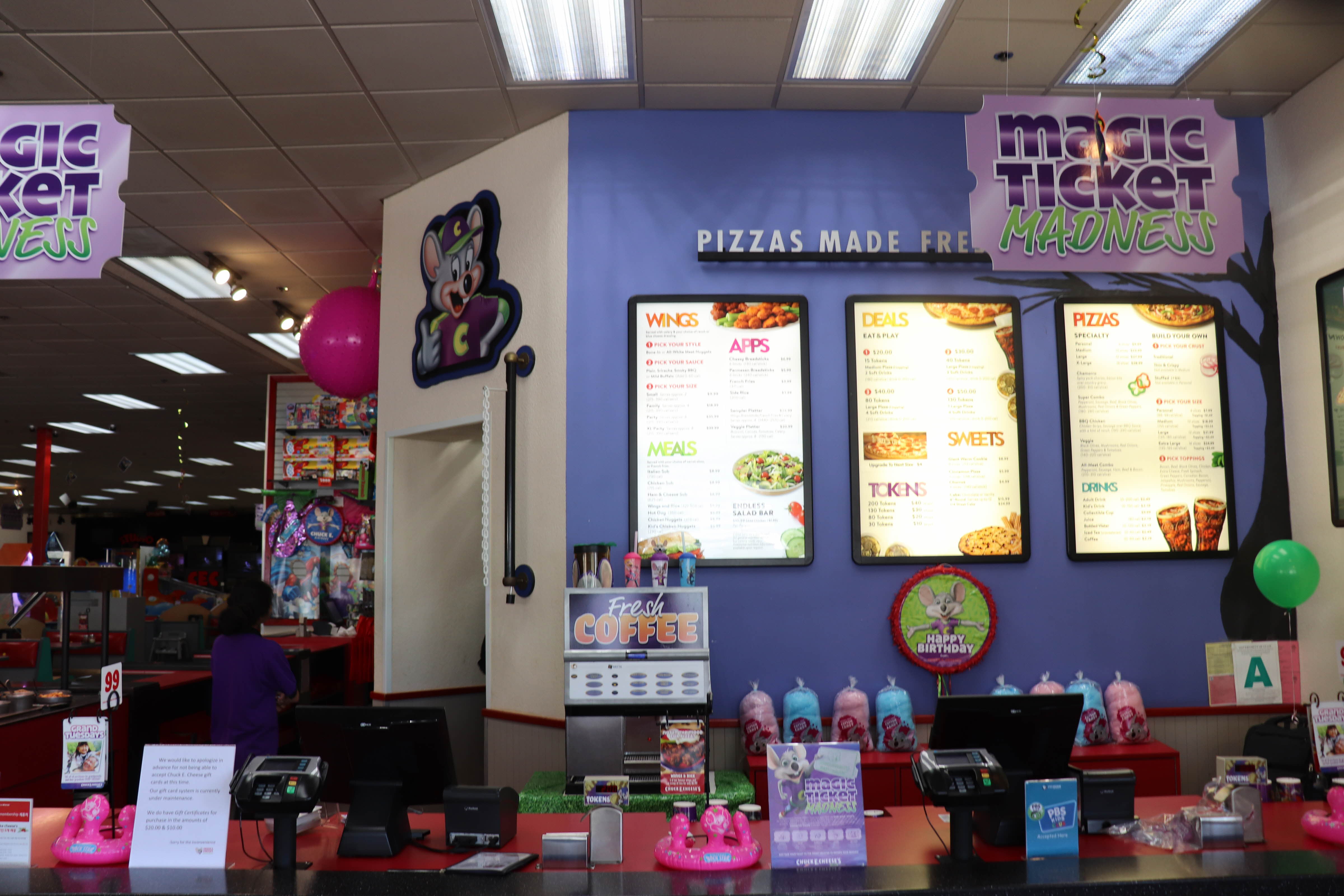 처키치즈(Chuck E. Cheese's) 내부에 테이블이 있고 음식도 판매를 했습니다