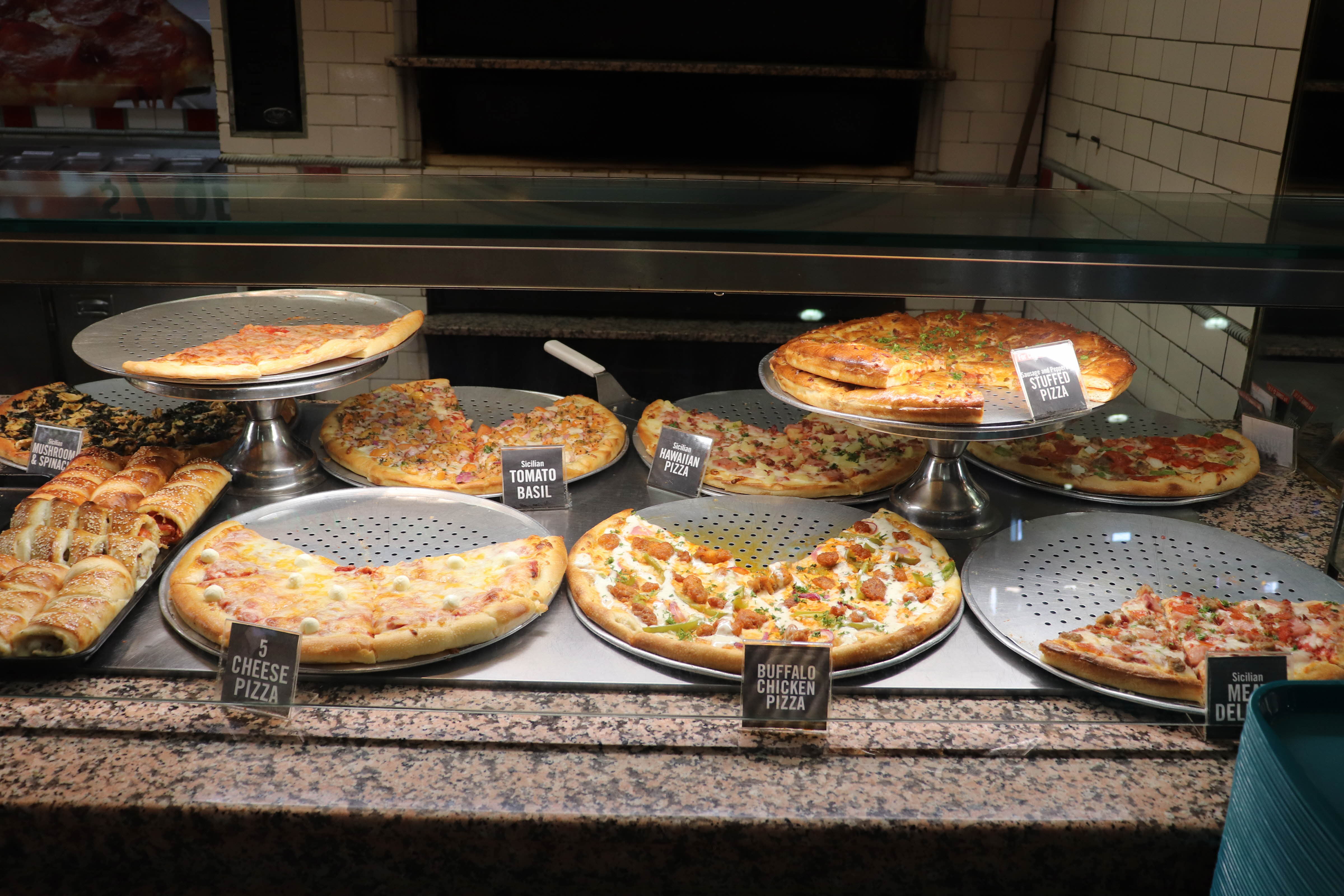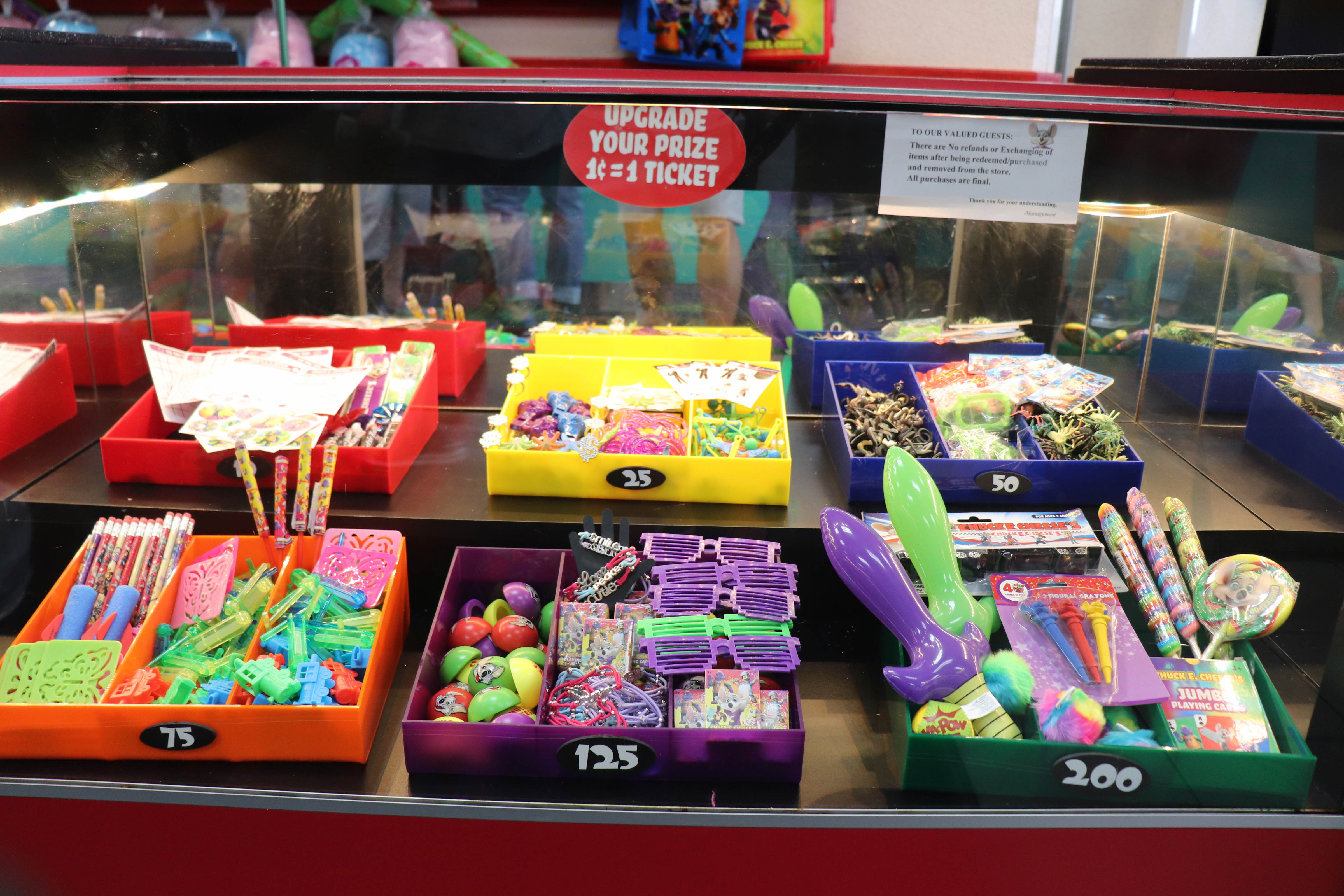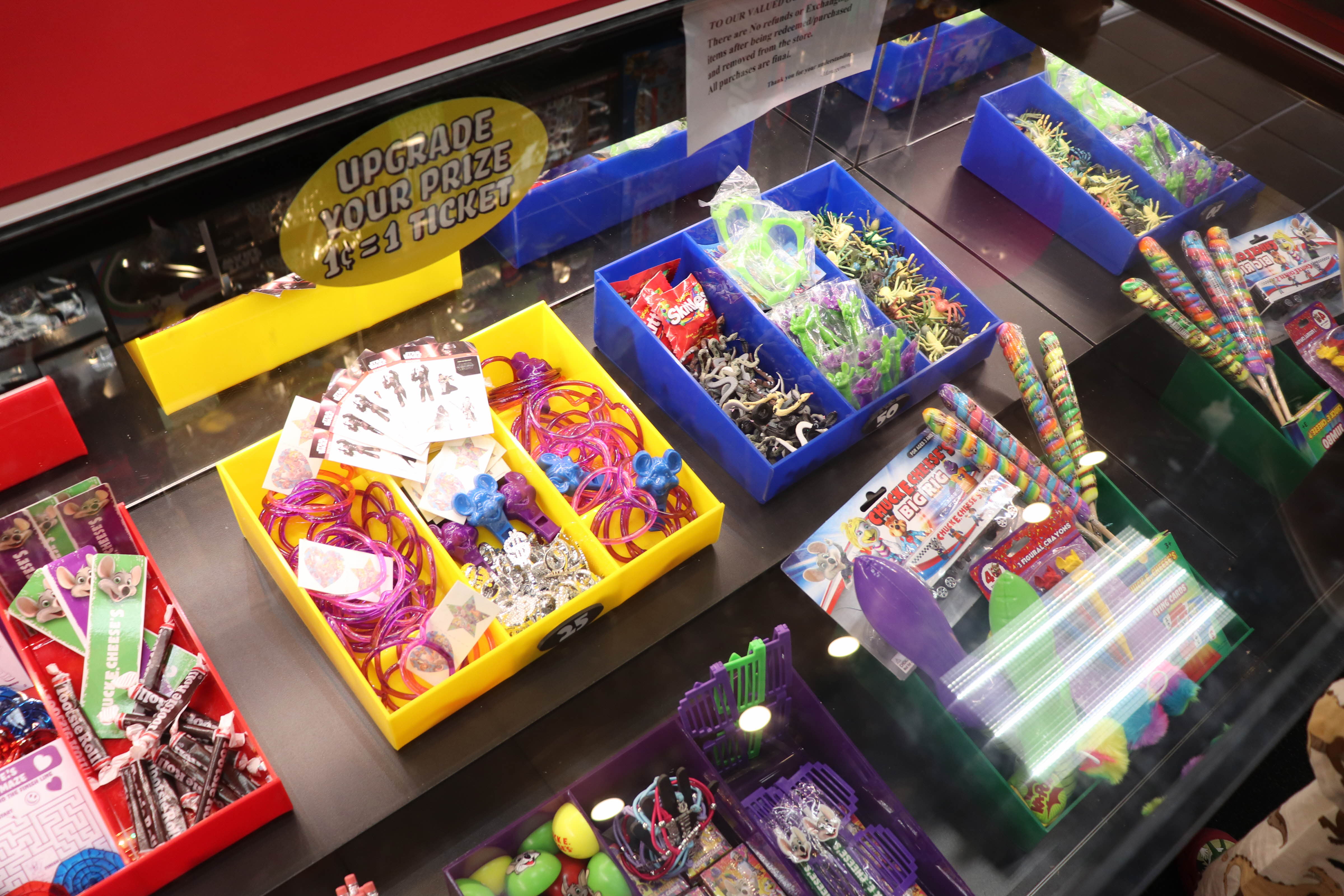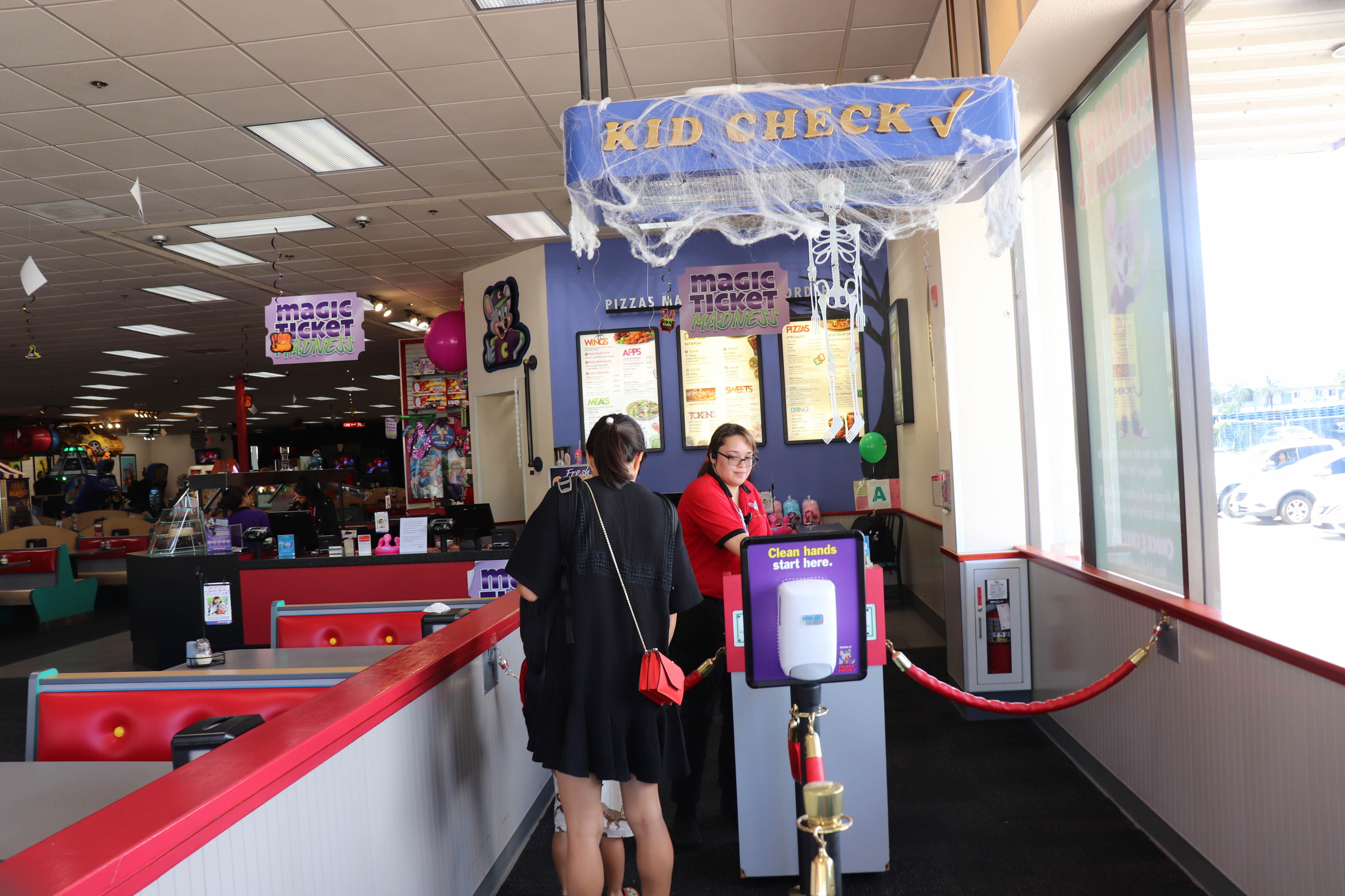처키치즈(Chuck E. Cheese's) 내부에 테이블이 있고 음식도 판매를 했습니다
