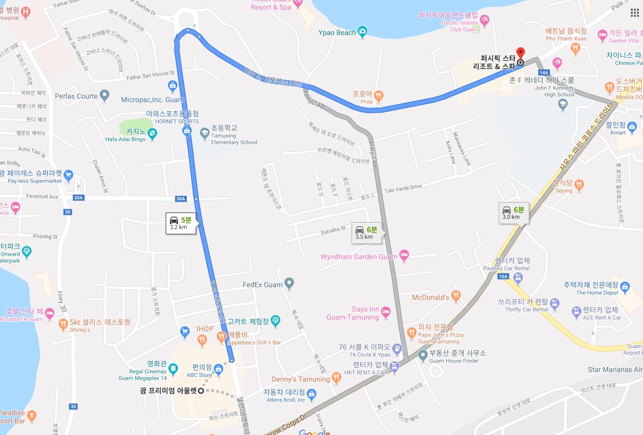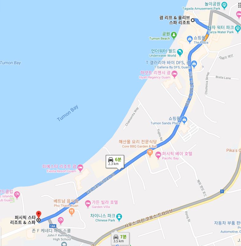 퍼시픽 스타 리조트 & 스파(Pacific Star Resort & Spa / PIC)에서 퍼시픽 아일랜드 클럽 괌(Pacific Islands Club Guam / PIC)까지 거리가 약 500m 정도로 도보로 5~6분 정도 걸렸습니다