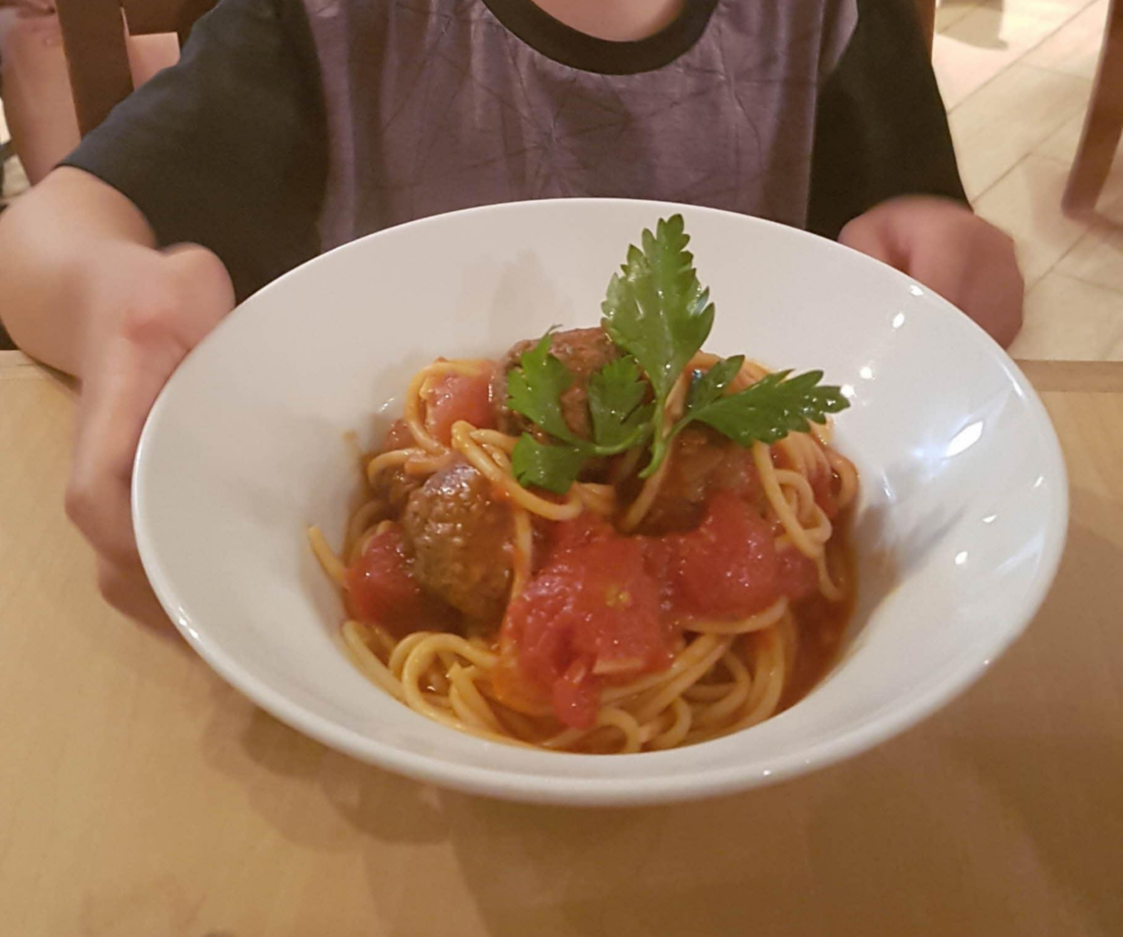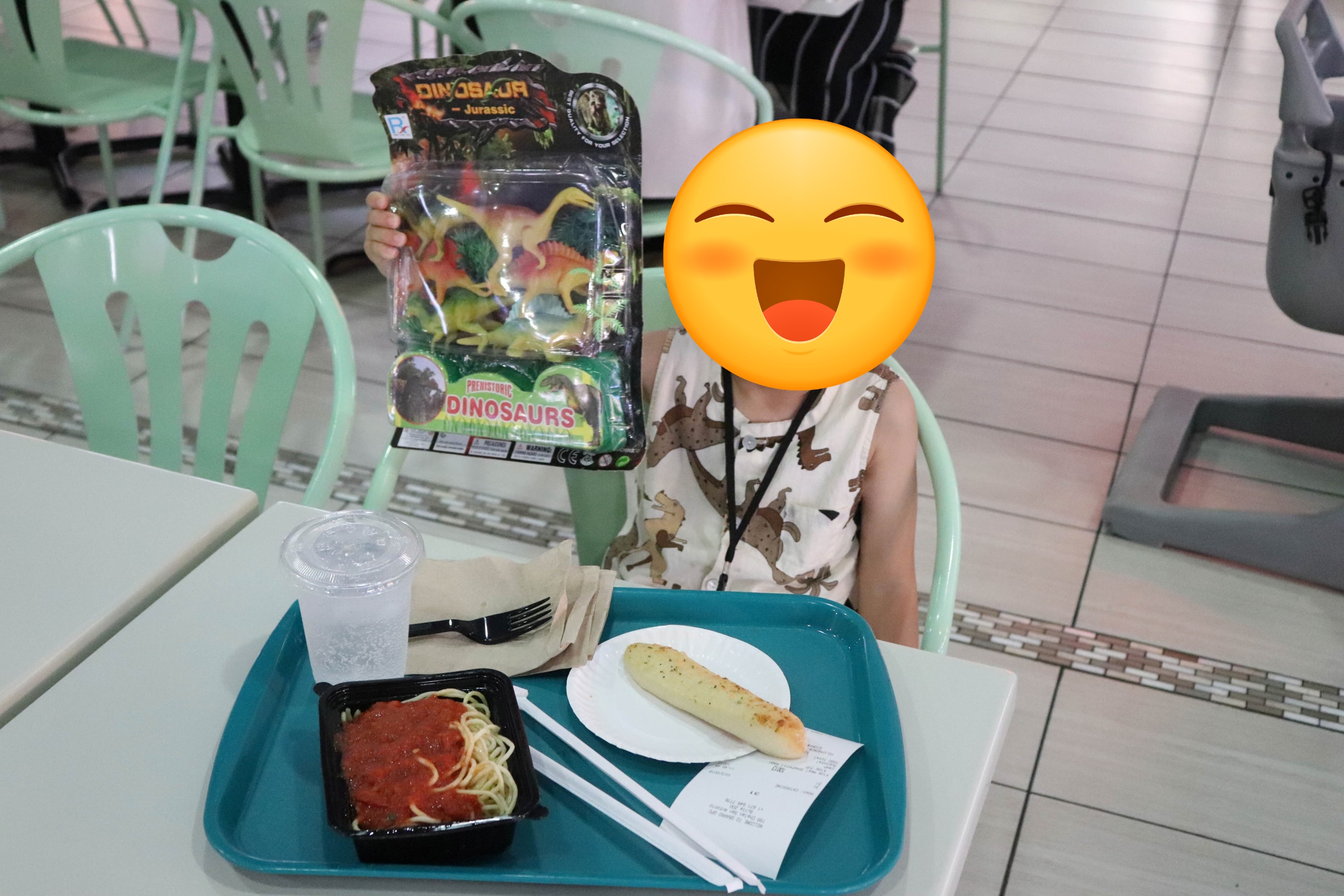 푸드 코트에서 아이가 토마토 스파게티를 먹고 싶다고 해서 맛있어 보이는 곳에서 어린이 세트를 주문하니 스파게티와 빵 그리고 공룡장난감을 줬습니다