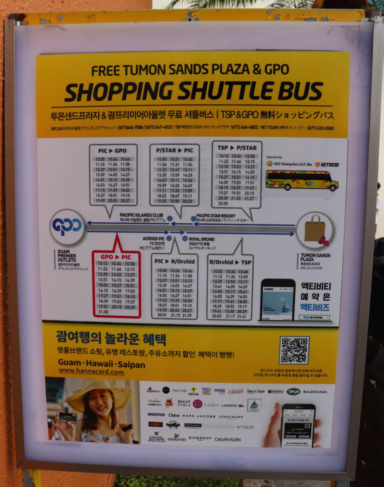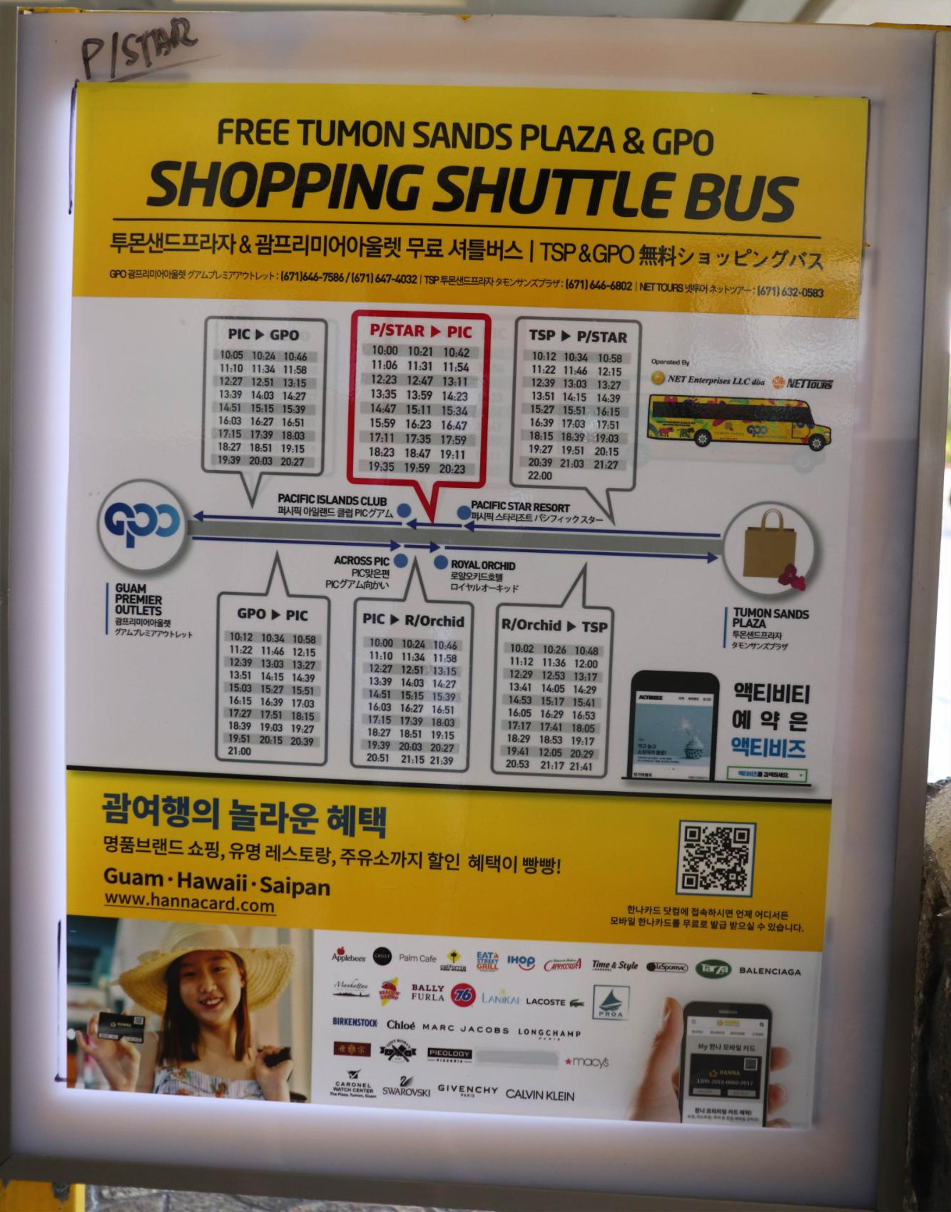 셔틀 버스 이용시 괌 프리미엄 아울렛(Guam Premier Outlets / GPO)으로 갈때는 퍼시픽 스타 리조트 & 스파(Pacific Star Resort & Spa) 로비 앞까지 버스가 왔으며 돌아오는 셔틀버스는 퍼시픽 아일랜드 클럽 괌(Pacific Islands Club Guam / PIC) 맞은편에 내릴 수 있었습니다